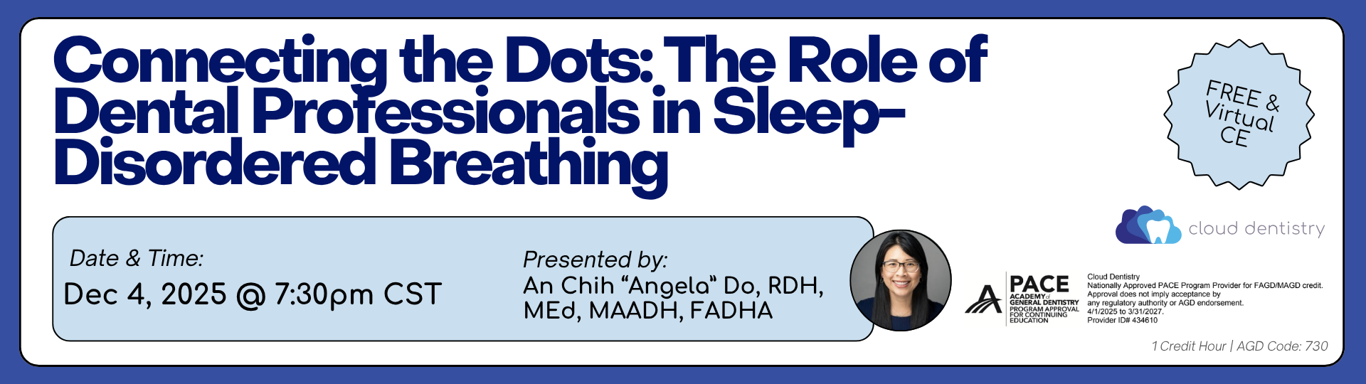 This is a foundational course designed to introduce dental professionals to the essential concepts linking oral development and sleep-disordered breathing (SDB). We will examine the connection between SDB and oral development. Underdeveloped jaws contribute to the root cause of SDB and its formation. By obstructing the upper airway and affecting facial structure and muscles, SDB significantly impacts patient well-being. Dental professionals should be alert for various signs and symptoms in children and adults of SDB during clinical evaluations. By understanding these indicators, we can effectively identify and assist patients toward a better quality of life.